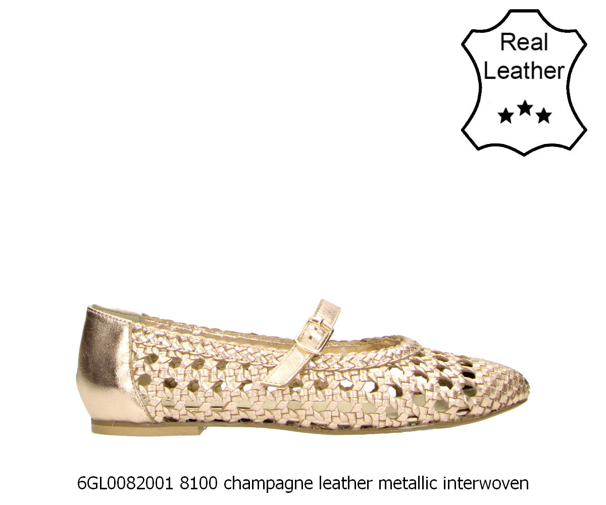 Crafted from premium champagne metallic leather with a refined interwoven pattern, this ballerina exudes sophistication. The soft inner lining adds extra comfort, while the sturdy outsole provides excellent support for all-day wear.